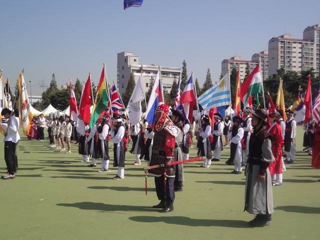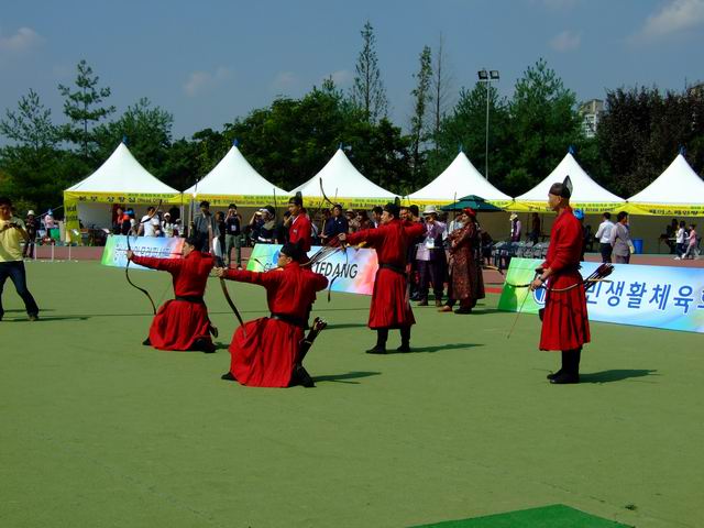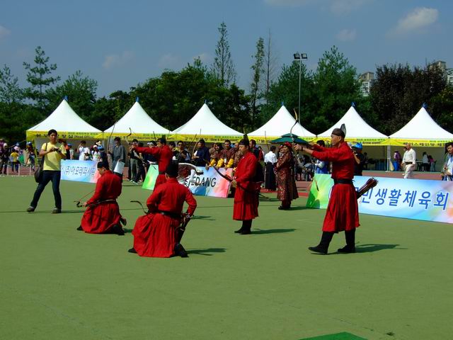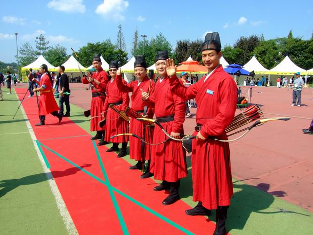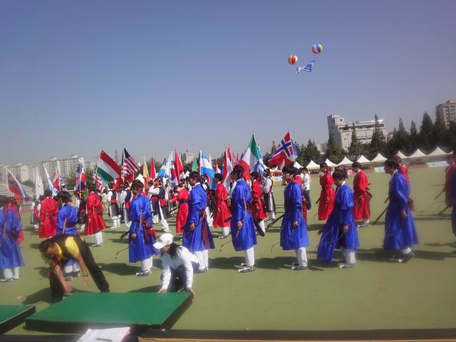 迟来的报道,由于回国后有一大堆的事情要处理,所以一直没能有时间发帖,现在补上,呵呵。 2011年世界传统弓箭年会在韩国的天安市举办,比赛规则和往年类似,稍有改动,靶子还是是三分靶,每轮5箭,5个靶位,分别是 90米韩国靶(高1.86米宽1.44米) (什么时候有中国特色的靶?我们的路还很长!!!!!!!) 今年的比赛地点设在天安市体育场,比赛第一天是开幕式和集体项目。 |